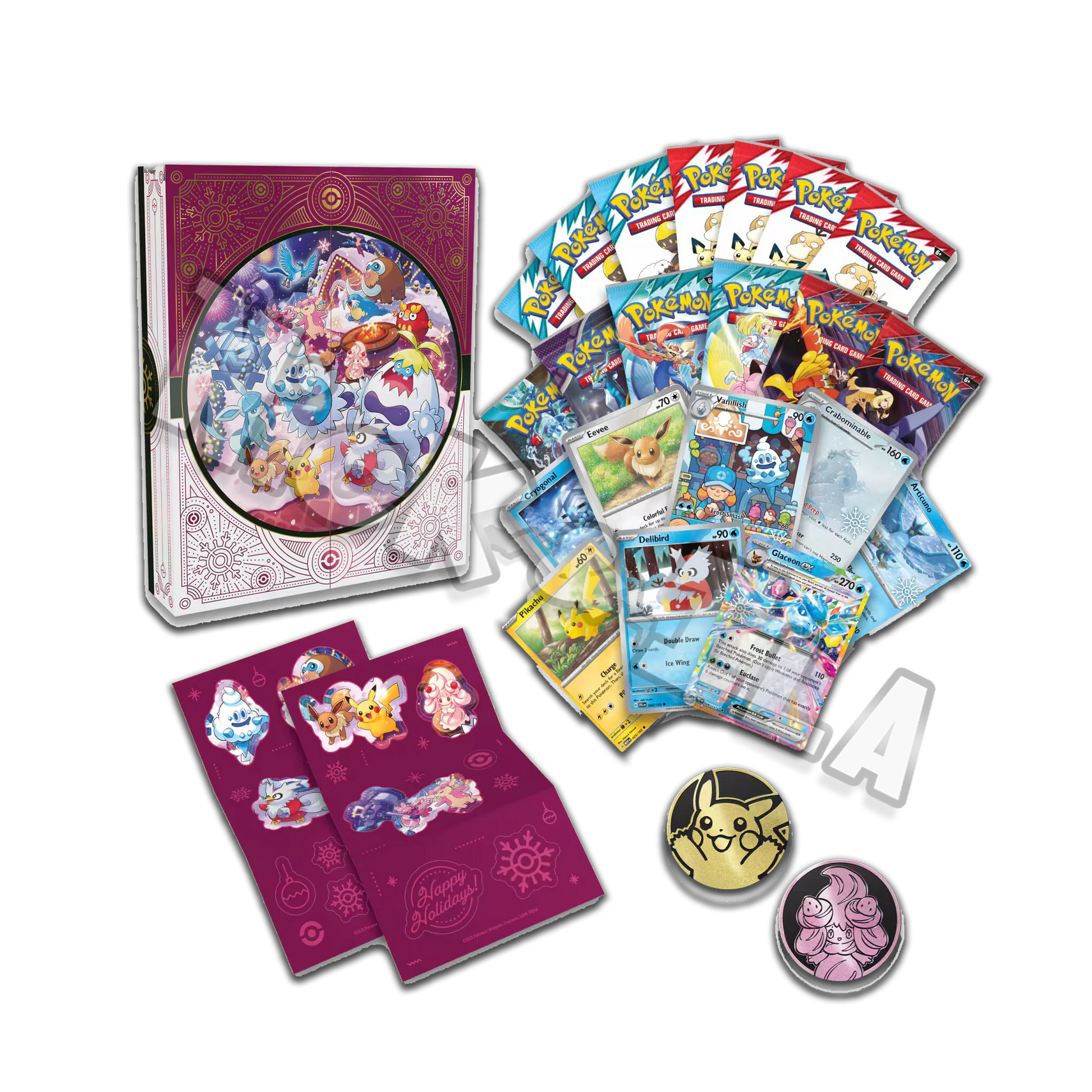 - Otto carte olografiche del GCC Pokémon con un logo a tema festivo